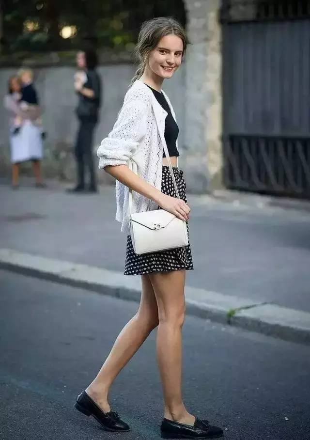 针织外套搭配短裙,重点当然是在露腿啦,秋天搭配一双乐福鞋也是相当机智的。▼