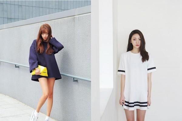 以前比较流行长款 tee 中穿打底裤,如今越来越流行将中长的 Tee 直接穿成连衣裙,露出长腿。而近几年很流行的太空棉卫衣,蓬松的大下摆再配上一条穿短裤,几乎看不见短裤的踪影,显得腿特别细。