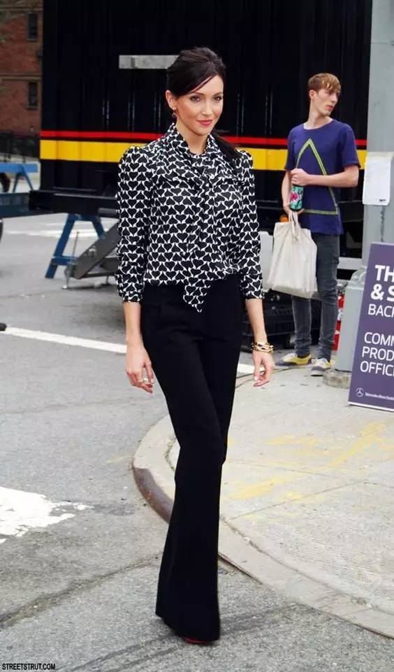 如果你是小个子女生,一定要选择高腰的阔腿裤款式,把衬衫压进裤腰,这个穿法最能够拉长你的双腿,给人以“肚脐以下都是腿”的即视感,轻松打造出完美比例。顺便把最容易显胖的小腿粗完美隐藏。无论是搭配高跟鞋 or 平底鞋,都能让你看上去且高且瘦时髦指数满分。