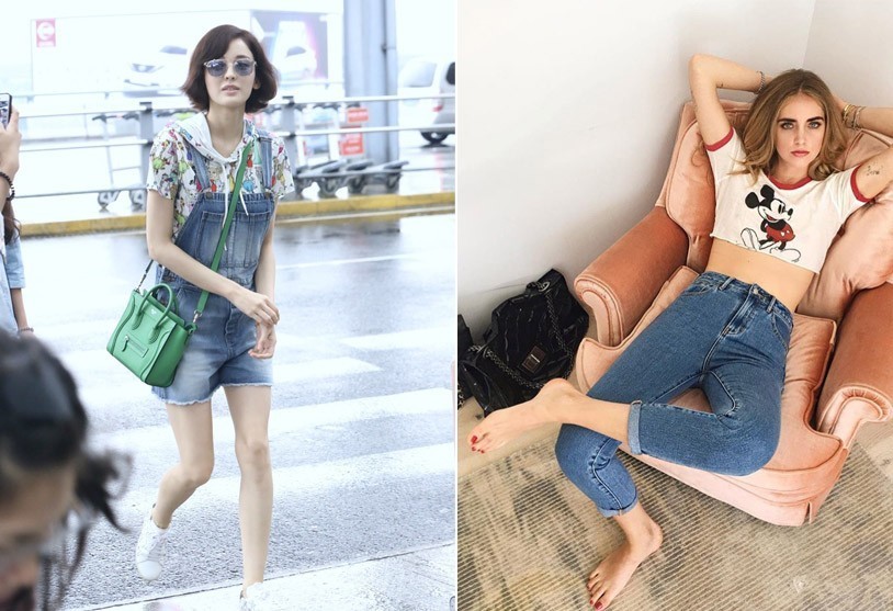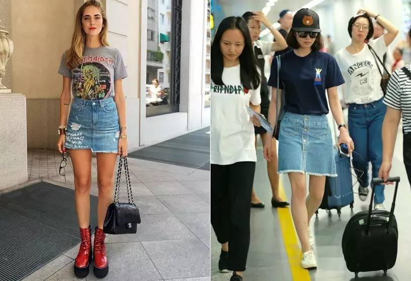 除了皮衣外,牛仔当然是卡通元素的又一好拍档。Look,美的人都在穿卡通T+牛仔A字裙。此组合最不挑身材。