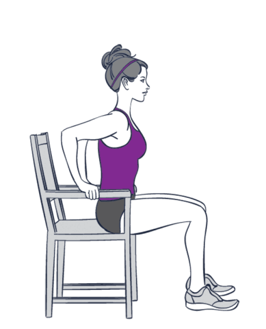 坐在椅子边缘,双手放在身体的两侧,掌心放在椅子的边缘,指尖朝下,双脚打开与肩同宽,臀部离开椅子向下,保持5秒,然后返回到椅子上,重复练习10次,练习3组。
