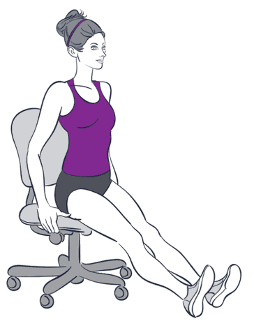 坐在椅子边缘,双手放在身体两侧,身体立直,抬右腿向上,伸直膝盖,脚尖回勾,保持3秒,然后还原,换另一条腿,重复练习10次,练习3组。