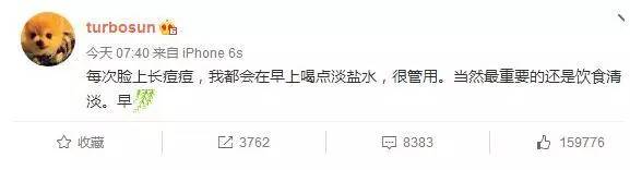 除此之外对于痘痘肌,孙俪也是有着自己的一套护理心得,那就是每天早上喝点淡盐水。