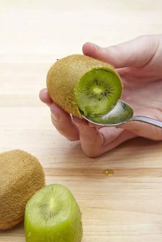 先把两端切掉,贴着表皮插入勺子,沿着边沿旋转一圈,就可以得到一颗完整的猕猴桃了!