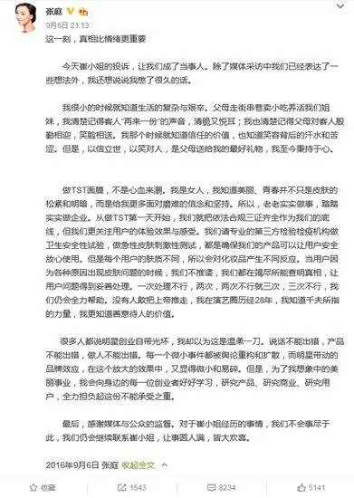 又有一位崔姓消费者爆出用了张庭研发的护肤品后,皮肤产生过敏现象,而客服则回应是在排毒。对此,张庭也在当晚发布了长文,表明会查明真相,让问题妥善处理。