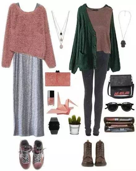 粉色搭配灰色很漂亮呢!利用夏天背心长裙外面在搭一件纯色毛衣,时尚感满满的呢!或者像右图粉色配绿色也是不错的选择,看北鼻们个人喜好啦!